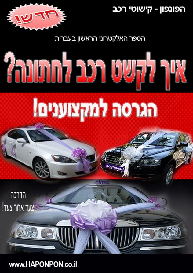 רוצים ללמוד לקשט רכבים לחתונה? הספר הדיגיטלי "איך לקשט רכב לחתונה? הגרסה למקצוענים" הוא הראשון והיחיד בעברית המכיל את כל הידע הנדרש ללמוד לקשט רכבים לחתונות באופן מקצועי. ידע שנצבר משנת 2009 ויושם בקישוט אלפי רכבי חתונה מכל הסוגים. אם אתם רוצים ללמוד לקשט רכבים – זה הספר עבורכם. הספר נותן ידע והדרכה מפורטת לייצור קישוט רכב לחתונה מא' ועד ת'. כיצד לומדים לקשט רכב לחתונה בקלות ובמהירות? לא פשוט לקשט רכבים לחתונה ללא הדרכה של מישהו מנוסה, בישראל אין מקום המלמד לקשט רכבים לחתונה באופן מקצועי ומקיף והדרך הסטנדרטית ללמוד לקשט רכבים עוברת בדרך כלל בעבודה בחנות פרחים. אם אתם רוצים להיכנס לתחום וללמוד את המקצוע בצורה יסודית, כדאי שתלמדו מאנשים עם ניסיון רב בתחום. להתרשמות מהמקצועיות שלנו אתם מוזמנים לשוטט באתר, לצפות בתמונות, לראות סרטונים ביוטיוב, לבקר בפייסבוק שלנו, לקרוא מה אומרים הלקוחות ולעשות גוגל. | ![]() |